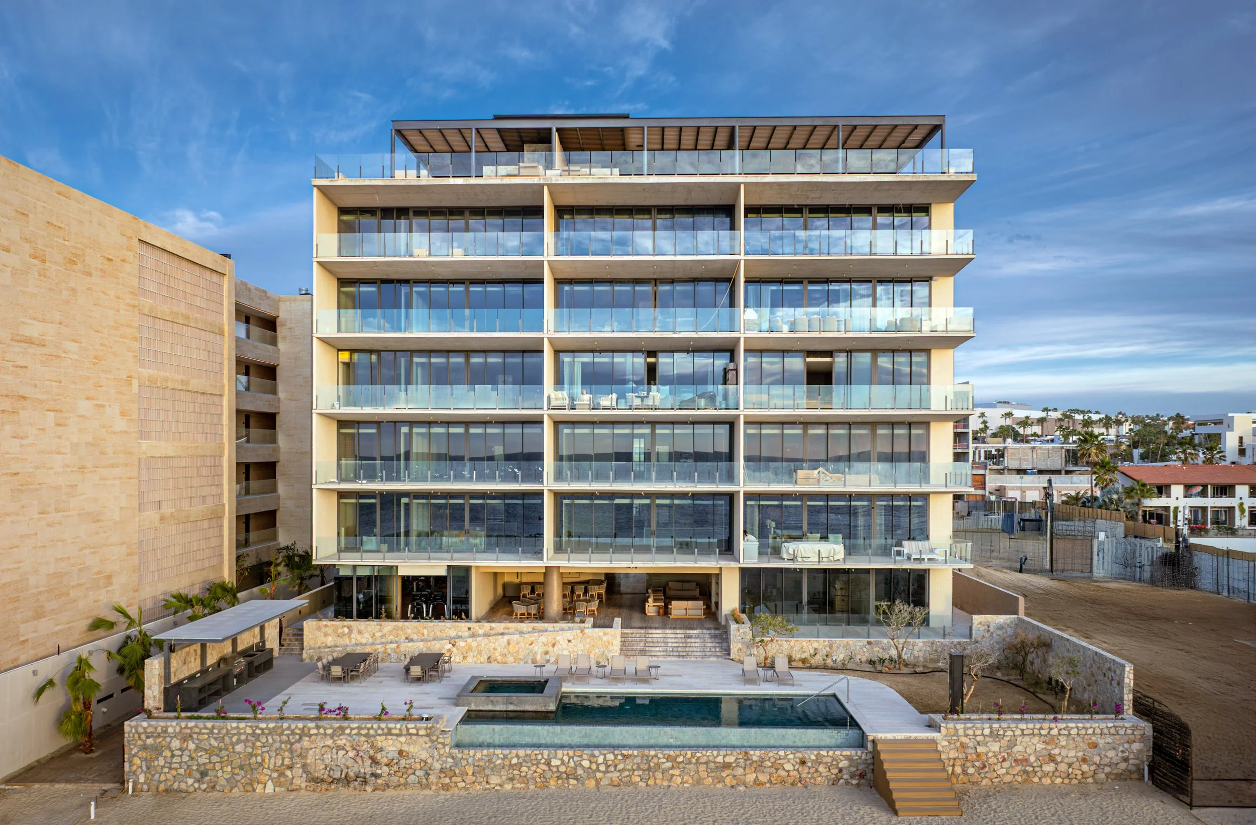 Despite its imposing six-story façade, EMMA houses only 16 residences. The 3- and 4-bedroom layouts range from 3,800 to 4,000 square feet, and dwarf com- parable luxury beachfront residences elsewhere in Los Cabos. Starting at $3.4 M USD - $68,000,000 MN.